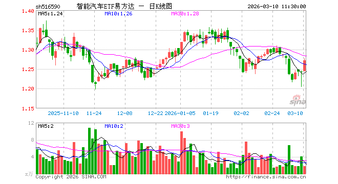3月10日,截止午间收盘,智能汽车ETF易方达(516590)涨2.42%,报1.272元,成交额219.71万元。智能汽车ETF易方达(516590)重仓股方面,宁德时代截止午盘涨6.01%,比亚迪跌0.77%,立讯精密涨5.96%,三花智控涨3.02%,汇川技术涨0.34%,赛力斯涨1.79%,豪威集团涨1.06%,亿纬锂能涨1.35%,拓普集团涨2.52%,华友钴业涨1.29%。